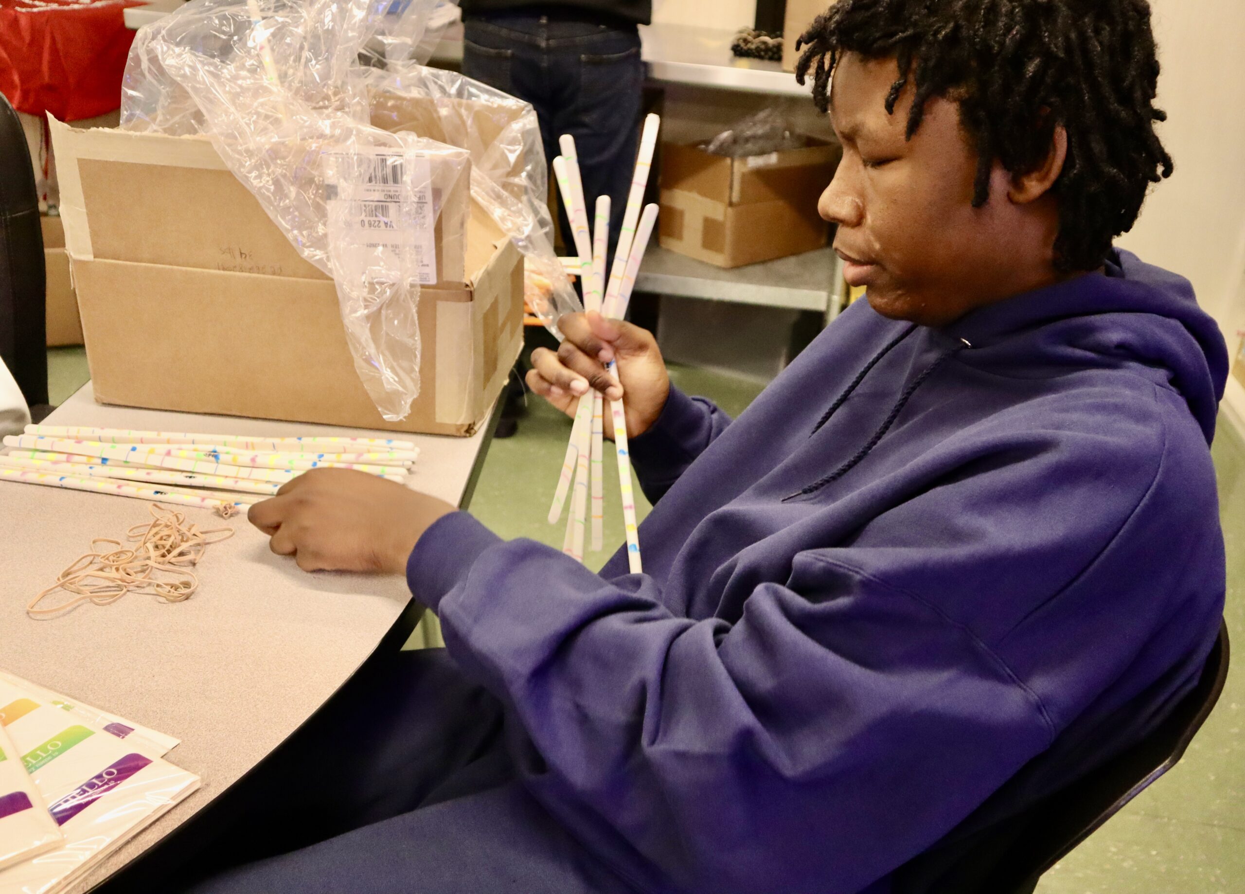 “It’s teaching me the life skills I need,” said D.S., a student in Teeter’s classroom. In addition to packaging materials for Ukeru training, he and his classmates also work at a local bakery, at a pizzeria, and help out around the school. The students submit their own timesheets and get paid for all the work they complete, whether it is out in the community or throughout the school.
